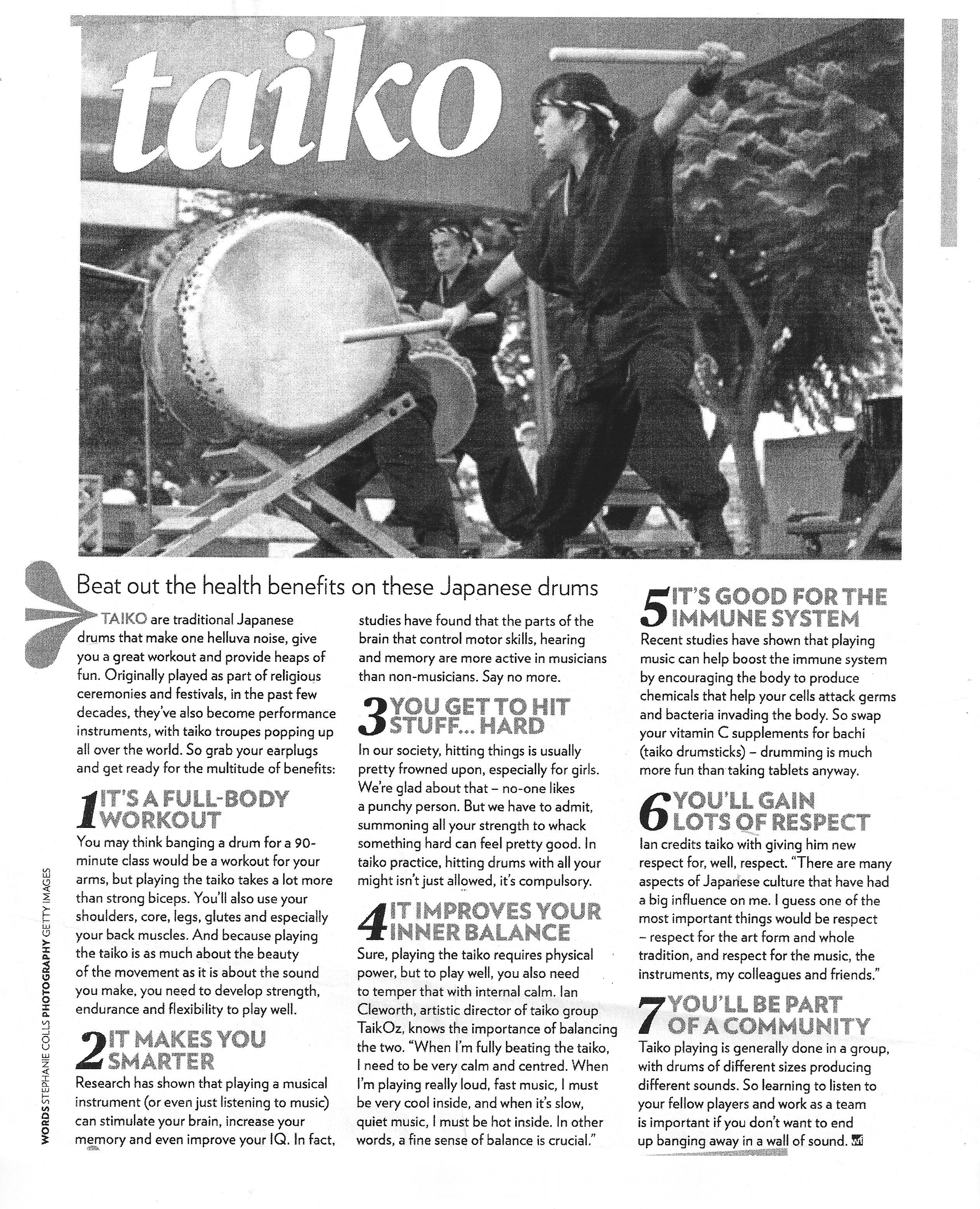 Sure, playing the taiko requires physical power, but to play well, you also need to temper that with internal calm. Ian Cleworth, artistic director of taiko group TaikOz, knows the importance of balancing the two. “When I’m fully beating the taiko, I need to be very calm and centred. When I’m playing really loud, fast music, I must be very cool inside, and when it’s slow, quiet music, I must be hot inside. In other words, a fine sense of balance is crucial.” - IT’S GOOD FOR THE IMMUNE SYSTEM