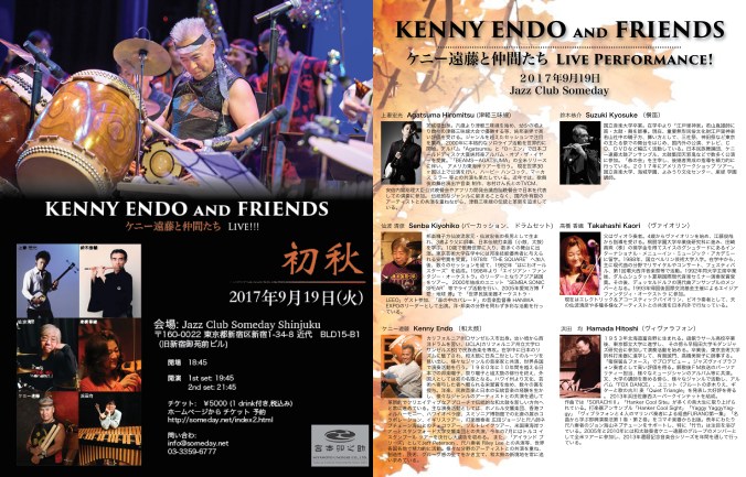 Taiko Center of the Pacific’s Artistic Director, Kenny Endo, will perform at ”初秋” (Hatsu Aki), a special concert featuring Hiromitsu Agatsuma (Tsugaru shamisen), Kyosuke Suzuki (yokobue), Kiyohiko Senba (percussion/drum set), Kaori Takahashi (electric violin), and Hitoshi Hamada (vibraphone). ONE NIGHT ONLY at Jazz Club Someday in Shinjuku, Tokyo!