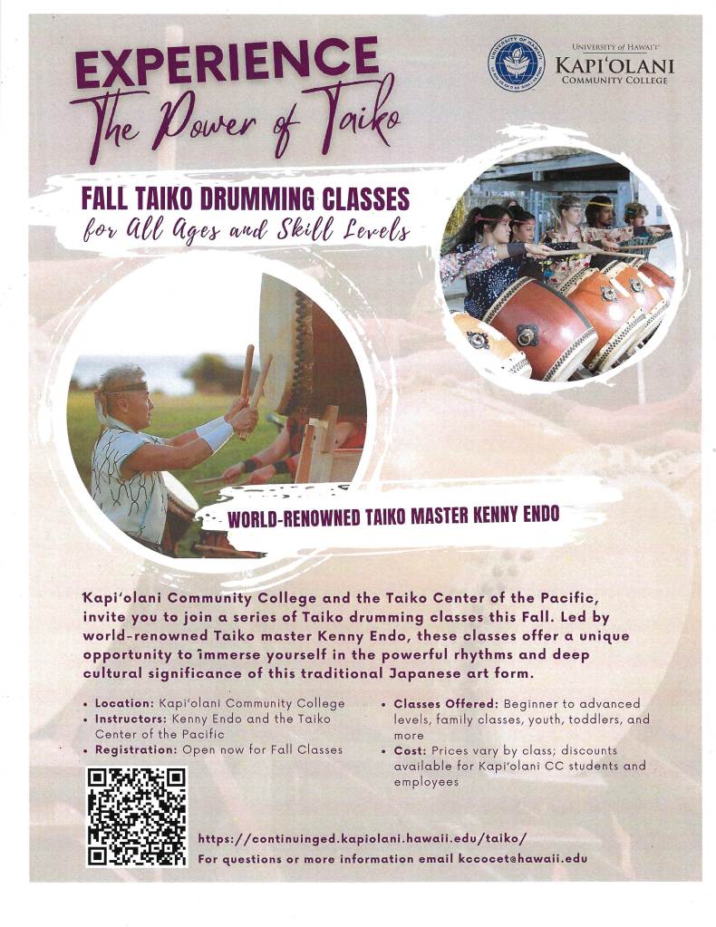 To register, go to: https://continuinged.kapiolani.hawaii.edu/taiko/