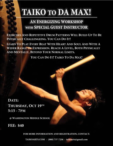 Past Workshops BonBop and Better Beta With instructor Sho’on Shibata!November 6, 2022 Taiko To Da Max! Featuring guest instructor Oda Yosuke!October 9, 2017 Share this: Click to share on X (Opens in new window) X Click to share on Facebook (Opens in new window) Facebook Like Loading...